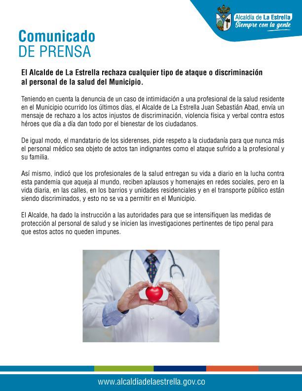 Sobre este hecho, el alcalde de la Estrella, Juan Sebastián Abad dijo que rechaza ese acto de «injusta discriminación, violencia física y verbal contra estos héroes que día a día dan todo por el bienestar de los ciudadanos».