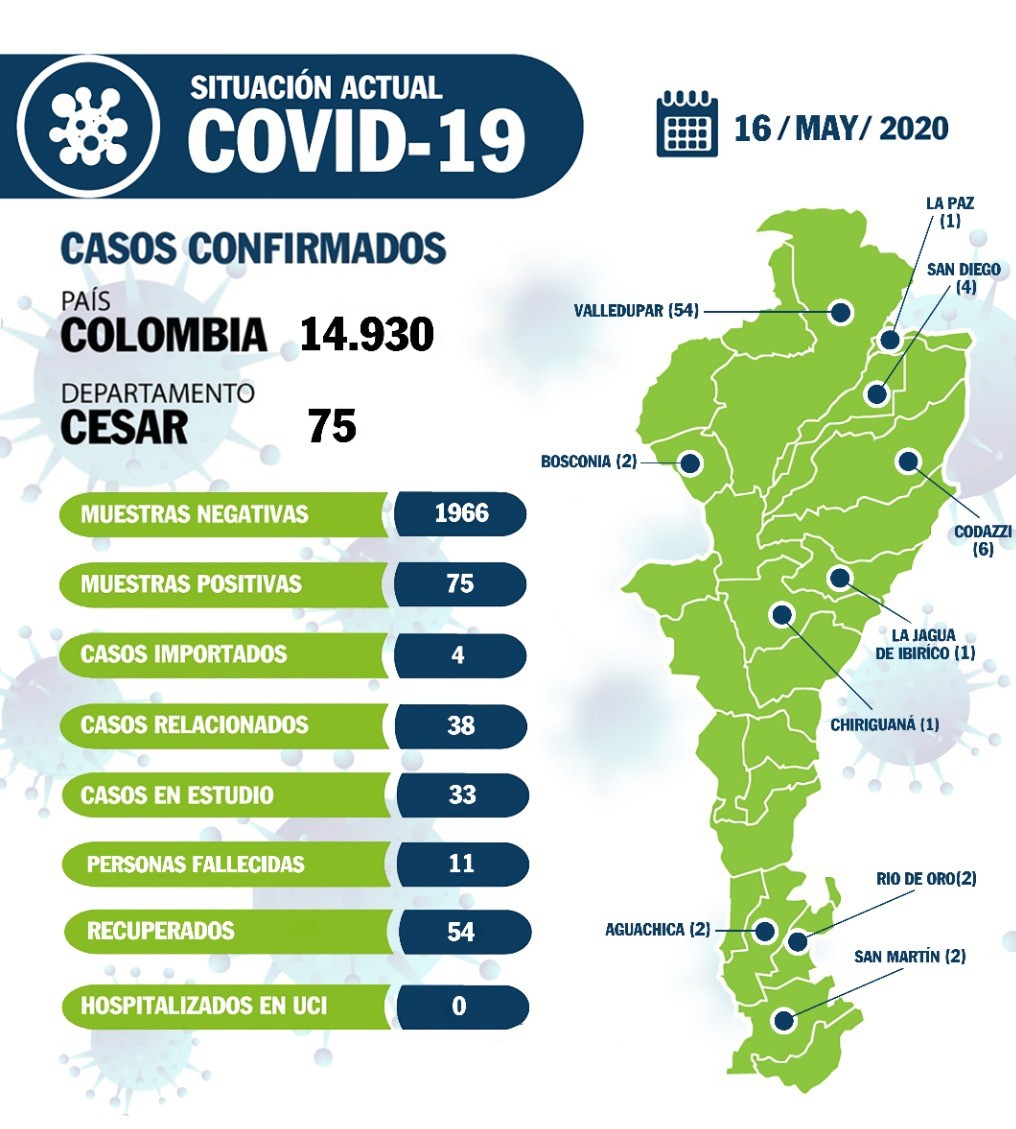 Según el último reporte, 75 casos positivos de Covid-19 registra el departamento del Cesar entre diez municipios, donde 54 pacientes están recuperados y otros 11 han fallecido. Sin embargo, estas cifras ubican a este territorio como uno de los más bajos en contagios con una tasa de 5,6, por cada 100.000 habitantes, desde que se presentó el primer positivo el 22 de marzo.