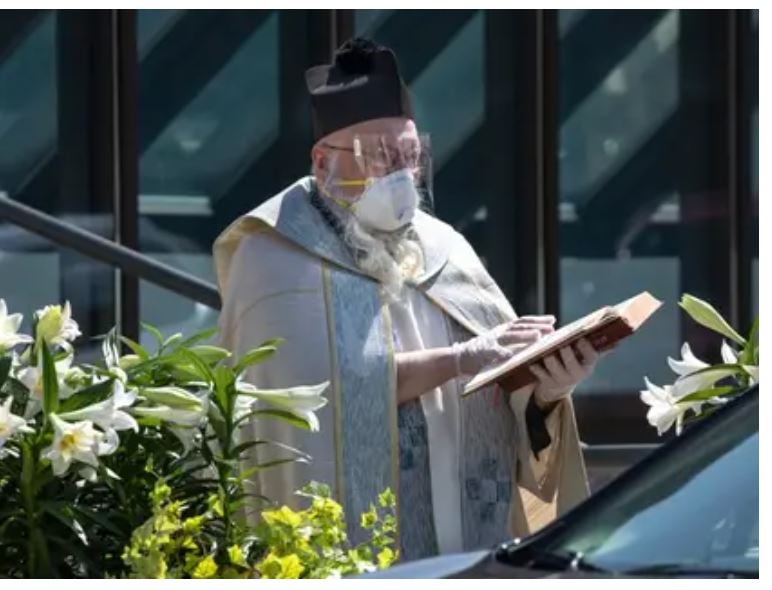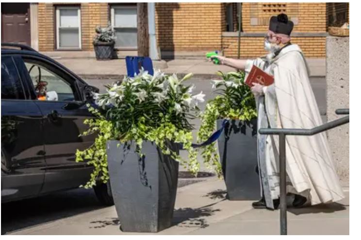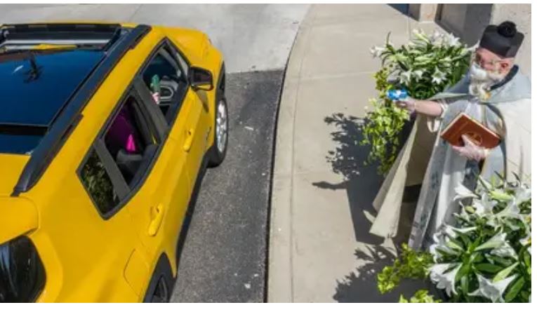 Durante las celebraciones de Semana Santa, el padre Tim Pelc utilizó una pequeña pistola de agua para bendecir a sus feligreses. El religioso estadounidense rellenó el arma de juguete con agua bendita, y desde una distancia segura, disparó a los devotos, que esperaron su turno dentro de sus autos.