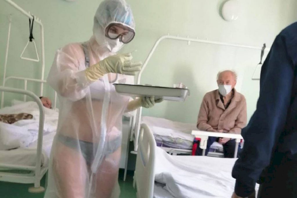 La imagen fue tomada por un paciente en una sala de hombres enfermos de COVID-19, en el Hospital Clínico Regional de Tula, ubicada a 160 kilómetros de Moscú. El autor de la foto aclara que ninguno de los presentes se quejó por la vestimenta de esta trabajadora de la salud.