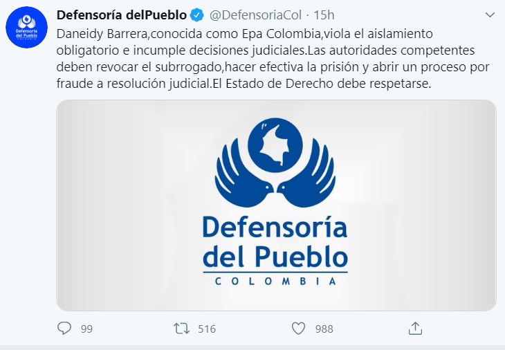 Defensoría pide enviar a prisión a Epa Colombia por violar cuarentena e incumplir orden judicial