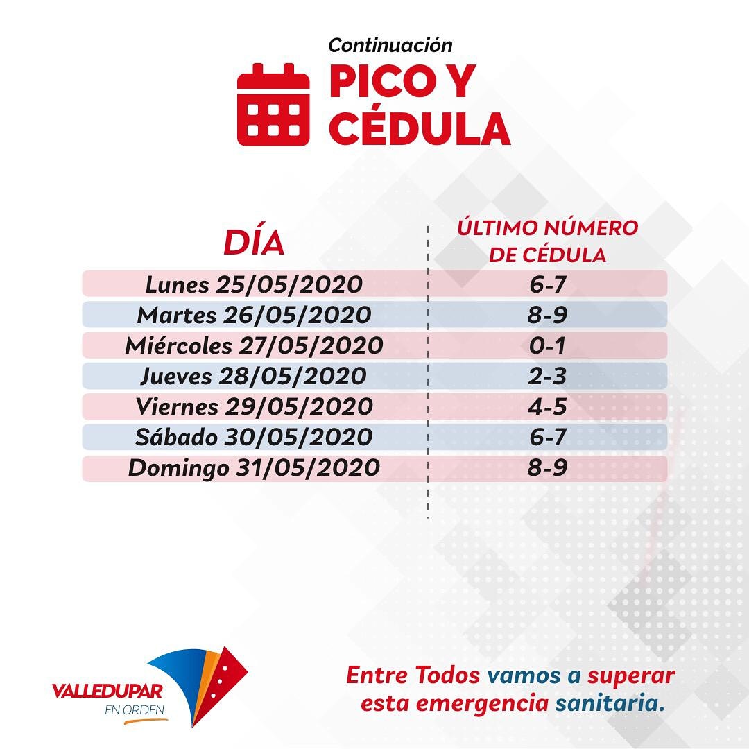 La Alcaldía de Valledupar estableció un nuevo pico y cédula hasta el 31 de mayo, como parte de las restricciones que se seguirán durante la cuarentena por el Covid-19.