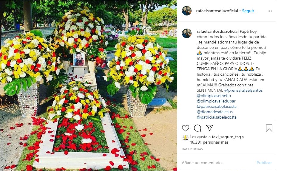 Por su parte su primogénito, en el hogar con Patricia Acosta; el cantante Rafael Santos, al que le hizo tantas canciones lindas y por el que mostraba mucha predilección Diomedes; también se hizo sentir en las redes sociales mostrando una foto de la morada del artista repleta de flores como ha sido costumbre familiar en cada aniversario y cumpleaños del cantante vallenato.