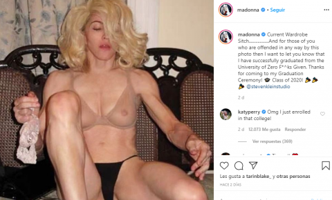 La cantante, actriz y empresaria estadounidense Madonna, generó controversia en redes sociales tras publicar una fotografía en la que se le observa sentada en un sillón utilizando únicamente la parte baja de un bikini, en color negro, y un sostén transparente en la que deja ver uno de sus pezones.