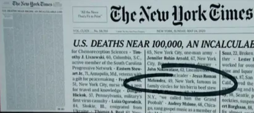 El periódico New York Times decidió hacer un homenaje de todas estas muertes por COVID-19 al incluir los nombres de las cerca de cien mil personas en la portada con el título “Una Pérdida Incalculable”.