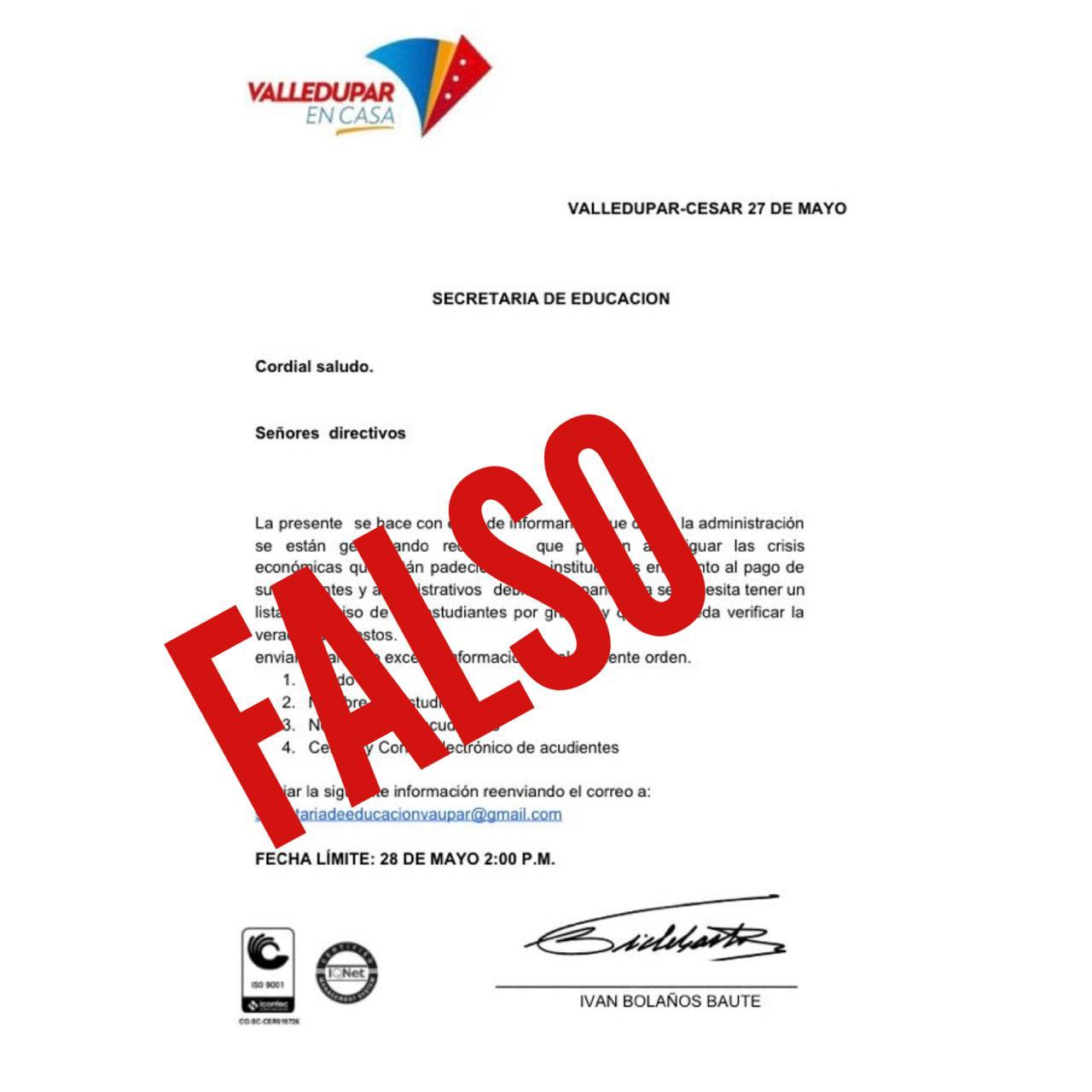 De manera fraudulenta, un grupo de personas ha estado solicitando, a nombre de la Secretaría de Educación de Valledupar, información de estudiantes, padres de familia y acudientes a los colegios no oficiales, situación es totalmente falsa, según lo indicó Iván Bolaño Baute, secretario de Educación Municipal.