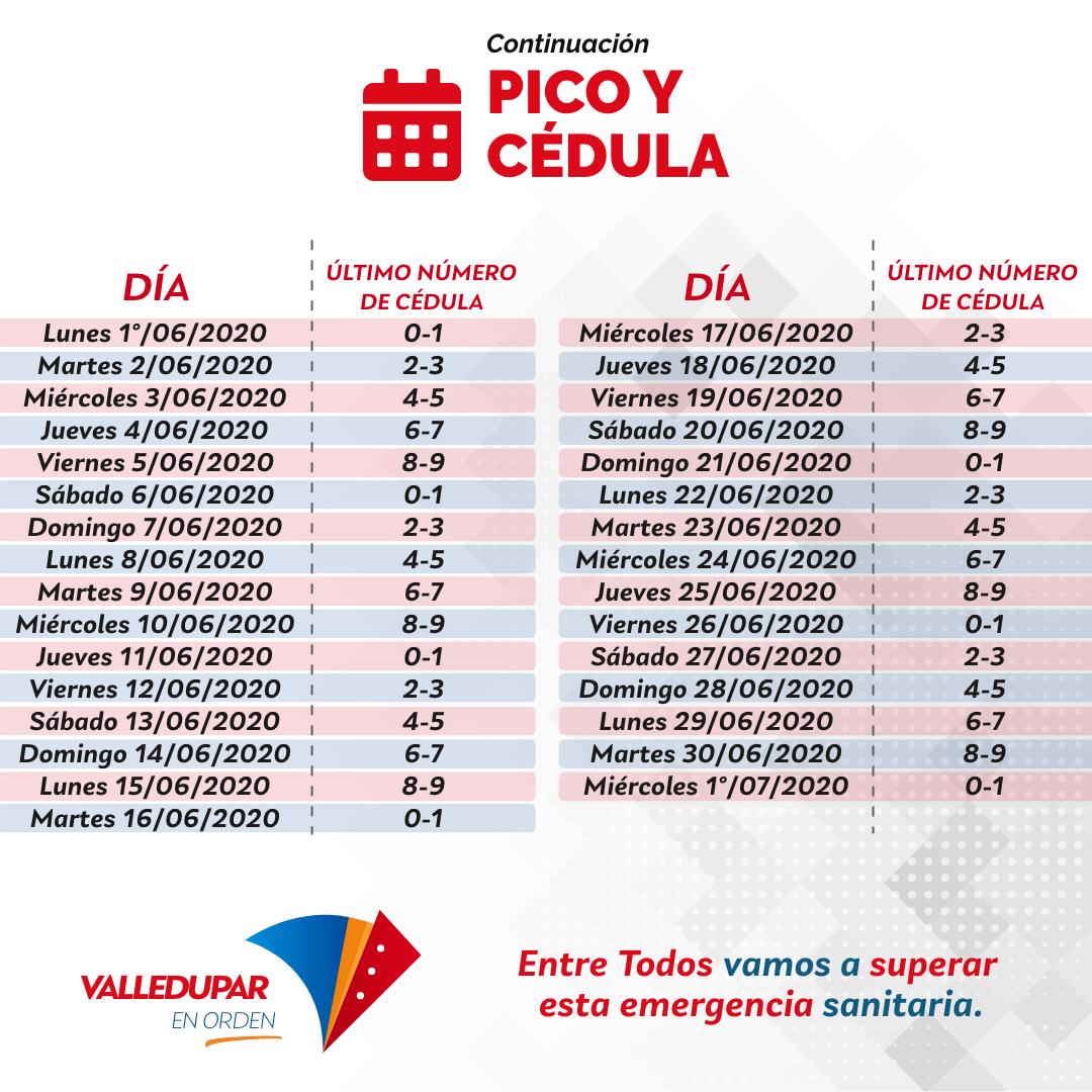 La Alcaldía de Valledupar estableció un nuevo pico y cédula del 1 de junio hasta el 1 de julio, como parte de las restricciones que se seguirán durante la cuarentena por el Covid-19. De acuerdo al último número en la cédula, las personas podrán salir de casa de la siguiente manera: