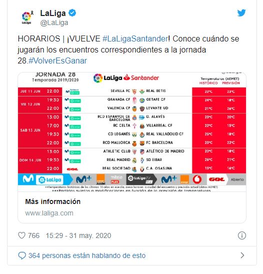 El fútbol español ya tiene fecha de regreso luego del parón por la pandemia del coronavirus. LaLiga publicó las fechas y horarios de los partidos correspondientes a las jornadas 28 y 29, que marcarán el regreso a la competencia después de tres meses. El derbi entre Sevilla y Real Betis el 11 de junio será el encargado de poner en marcha nuevamente la actividad en ese país, donde el 1 de junio volverán las prácticas colectivas para los clubes.