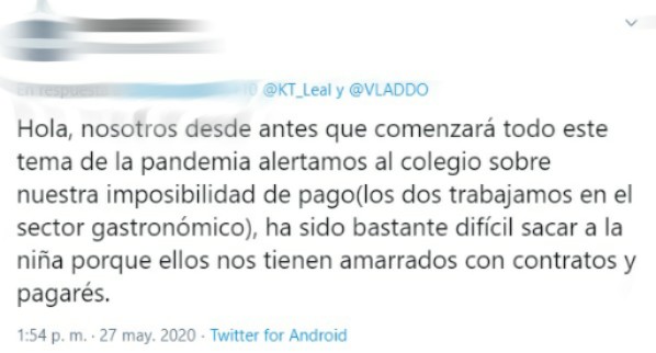 Sin embargo, relató que el colegio se negó a hacer algún tipo de descuento y que contrario a lo que esperaba, la institución aceptó el retiro de sus dos hijas.