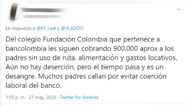 Así lo indicó la señora María, otra madre de familia de dos niñas que estudian en el Liceo Hermano Miguel de La Salle en Bogotá. «No estoy laborando y no tengo ningún tipo de ingreso. Estoy viviendo de mis ahorros, por lo que necesitábamos la colaboración del colegio con un descuento o nos íbamos a ver obligado a retirar a nuestras dos hijitas», contó la mujer.