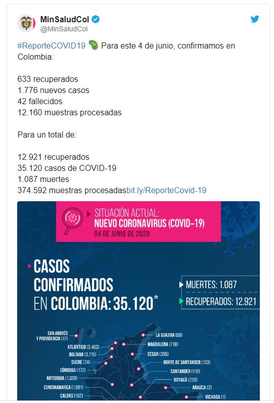 El número total de muertes por coronavirus en Colombia subió a 1.087, co 42 casos hoy.