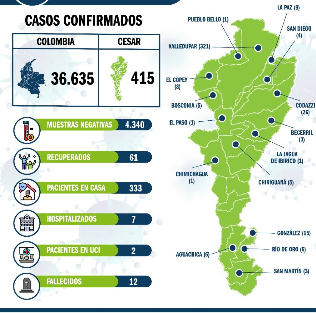 Veinte nuevos casos de Covid-19 confirmó el Laboratorio de Salud Pública para el Cesar, para sumar un total de 415 contagiados. La procedencia de los nuevos positivos corresponden a Valledupar (15), El Copey (2), Río de Oro(2) y Agustín Codazzi (1).