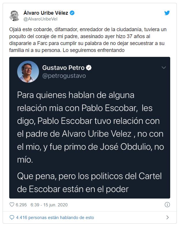 Y es que el mensaje que había mandado Petro fue bastante fuerte. Al negar un supuesto vínculo con Pablo Escobar, dijo que el narco “tuvo relación con el padre de Álvaro Uribe Vélez, no con el mío”.