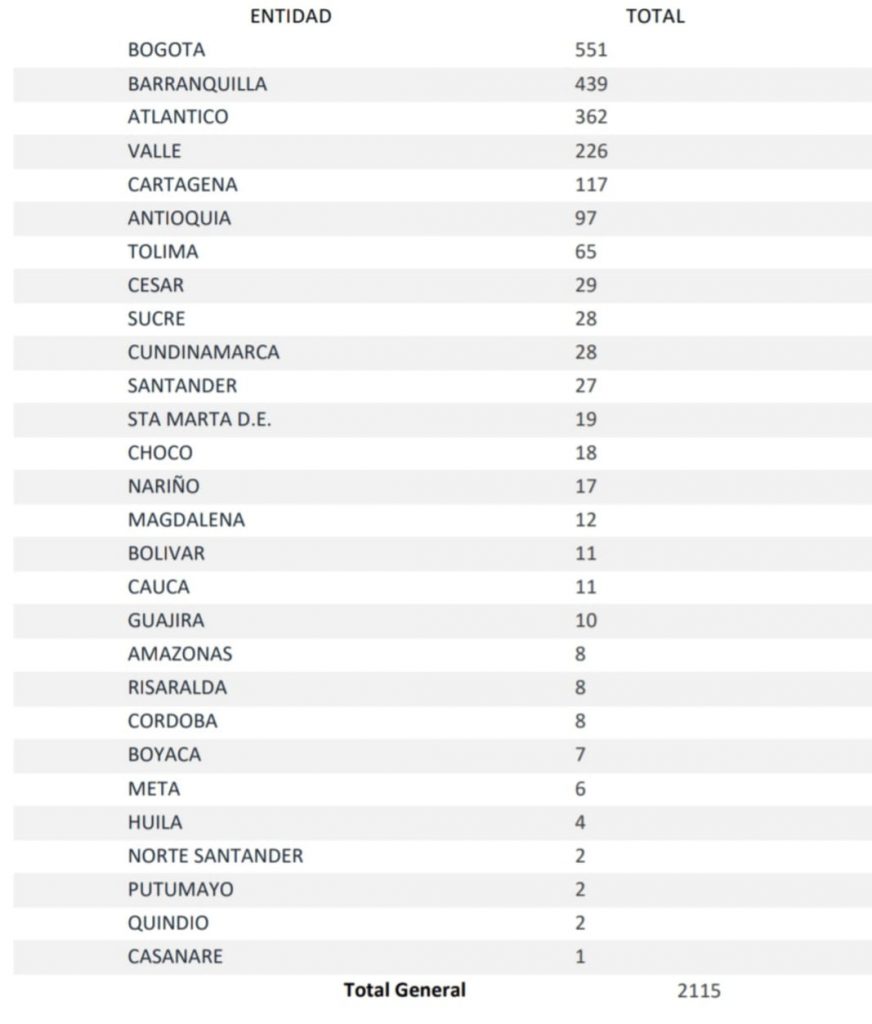 El Ministerio de Salud informó este miércoles 2.115 nuevos casos de Coronavirus en Colombia con lo que la cifra llega a 57.046 en total.Asimismo, notificaron que la cifra de muertos en Colombia llegó a 1.864 tras el fallecimiento de 63 personas más.
