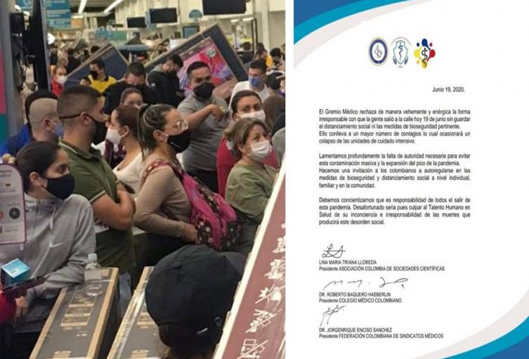 Ante lo sucedido en el día de ayer viernes 19 de junio con la implementación del Día sin el Impuesto sobre el Valor Agregado – IVA en Colombia, donde en muchas ciudades del país se evidenció una vez más, la falta de conciencia social de las personas ante el inminente peligro que representa actualmente el virus de la Covid-19 para la raza humana, cuyas cifras no son nada alentadoras para mundo con cerca de 8.500.000, mientras que para Colombia hay 63.276 casos positivos y 2.045 muertes, el gremio médico rechazó el desorden y falta de precaución con las medidas sanitarias.