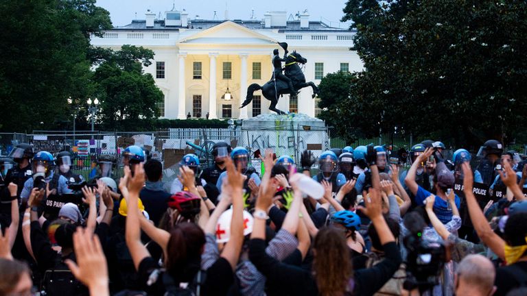 Un grupo de manifestantes antirracistas intentó este lunes derribar una estatua del expresidente de EE UU Andrew Jackson en las inmediaciones de la Casa Blanca. Además, cientos de ellos trataron de ocupar el Parque Lafayette, que se encuentra enfrente de la residencia presidencial, para crear lo que denominaron una “zona autónoma Casa Negra”, similar a la “zona autónoma de Capitol Hill” en Seattle. Los manifestantes también escribieron BHAZ, las siglas de Black House Autonomous Zone, en la Iglesia de St. John.