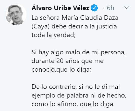 En su cuenta de Twitter, el expresidente Álvaro Uribe escribió este sábado que “la señora María Claudia Daza (Caya) debe decir a la justicia toda la verdad; Si hay algo malo de mi persona, durante 20 años que me conoció, que lo diga; De lo contrario, si no le di mal ejemplo de palabra ni de hecho, como lo afirmo, que lo diga”.