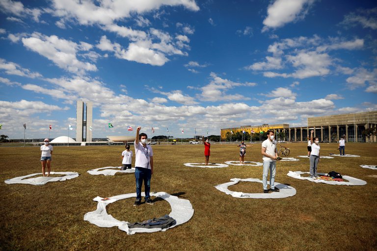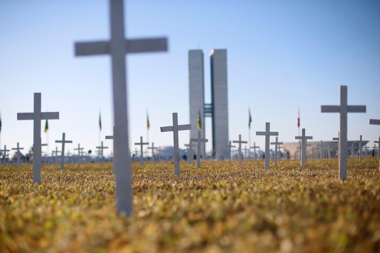 Mil cruces clavadas frente al Congreso brasileño como parte de una manifestación simbólica, silenciosa y de impacto recordaron este domingo las más de 57.000 víctimas que la pandemia del coronavirus dejó hasta el momento en Brasil.