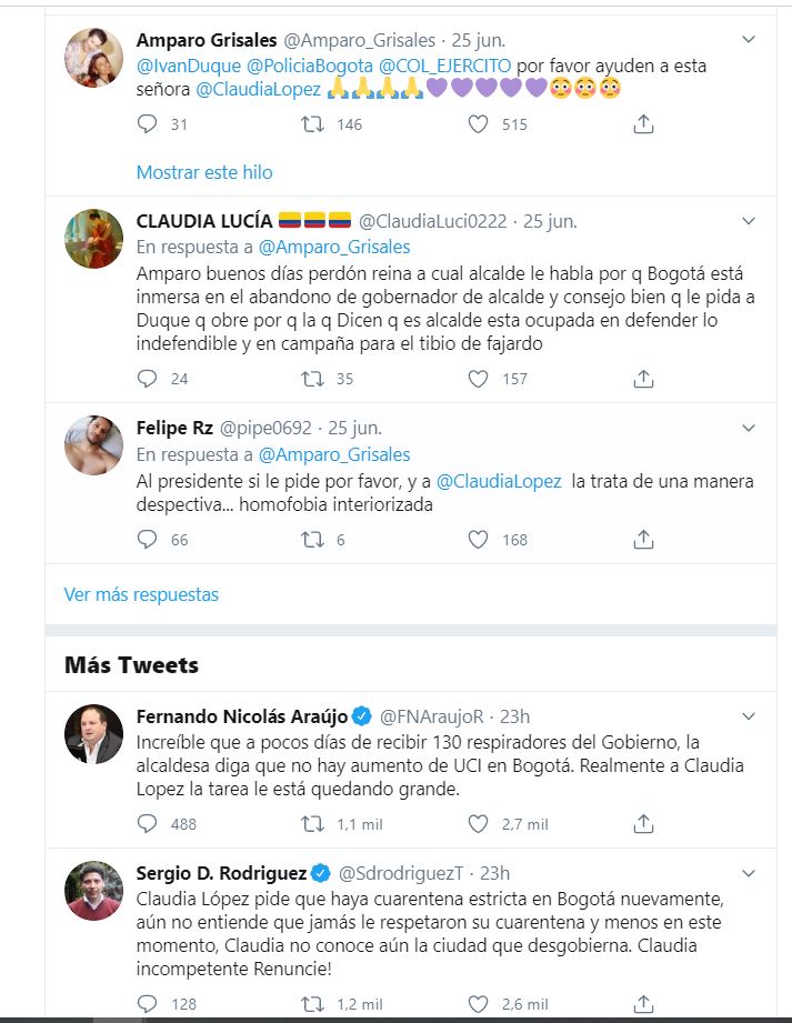 En esta ocasión, la actriz se convirtió en tendencia en Twitter debido al regaño que le dio a la alcaldesa de Bogotá, Claudia López Hernández, por tener la capital tan «descuidada» en temas de seguridad, pues debido a la cuarentena que se está viviendo en el país a causa de la pandemia del coronavirus han aumentado los casos delincuenciales.