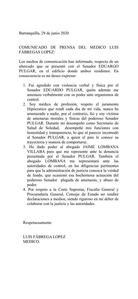El recepcionista del edificio que no estaba en ese momento en su puesto y se percata del asunto, corre hacia la recepción para abrir a través de un interruptor la puerta de ingreso al edificio. Entran varios hombres a tratar de mediar para que el furibundo Senador no golpee al médico Fábregas y en varias oportunidad, pese a que se le interpusieron varios escoltas, el senador Pulgar le lanza varias patadas sin lograr alcanzarlo.
