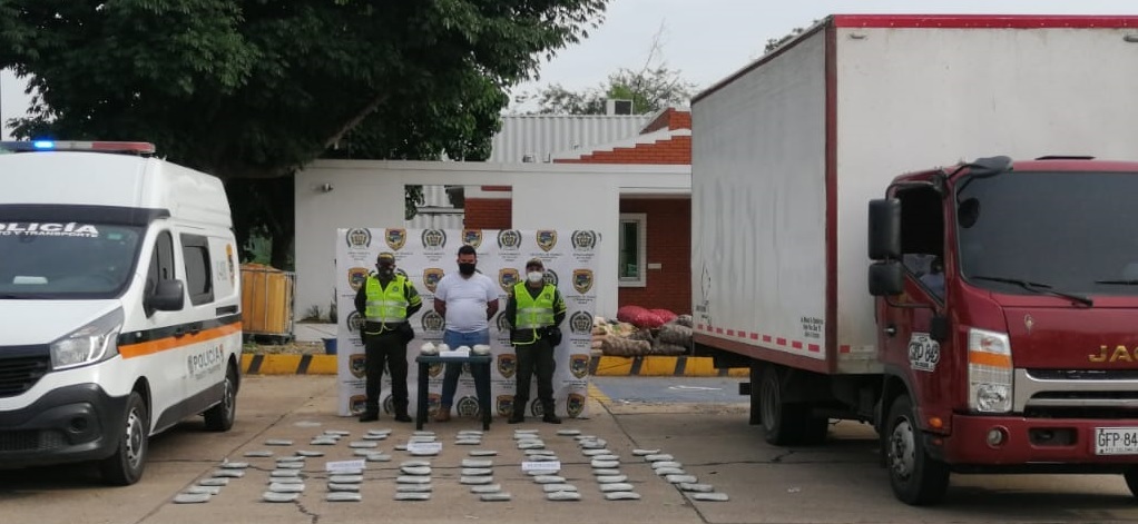 En la vía Bosconia-Curumaní, unidades de la seccional de tránsito y transporte de la Policía, en desarrollo de controles en las diferentes vías del Cesar, capturaron a una persona y le incautaron 75 kilogramos de marihuana y cuatro kilos de base de coca, dentro de un camión en el cual se transportaba una carga de verduras.