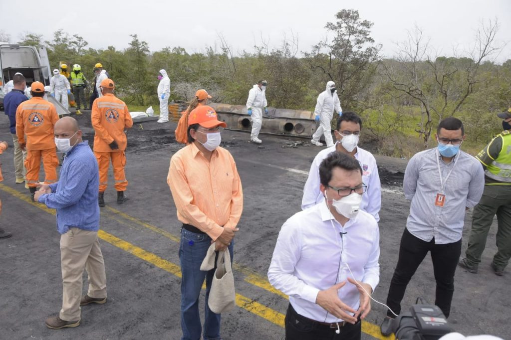 “Ocurrió un suceso lamentable a las 7 de la mañana, un vehículo cisterna cargado con combustible se salió de la vía, al parecer, por un microsueño del conductor, él se salva porque sale del vehículo que al poco tiempo estalla. Había unas personas sobre el vehículo que no venían en él y otras observando, lamentablemente esta situación de imprudencia provocó que siete personas murieran calcinadas y 49 resultaran heridas”, dijo Caicedo.