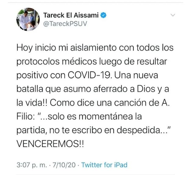 A través de un mensaje vía twitter, El Aissami agregó que «hoy inicio mi aislamiento con todos los protocolos médicos luego de resultar positivo con COVID-19. Una nueva batalla que asumo aferrado a Dios y a la vida!! Como dice una canción de A. Filio: “…solo es momentánea la partida, no te escribo en despedida…” VENCEREMOS!».