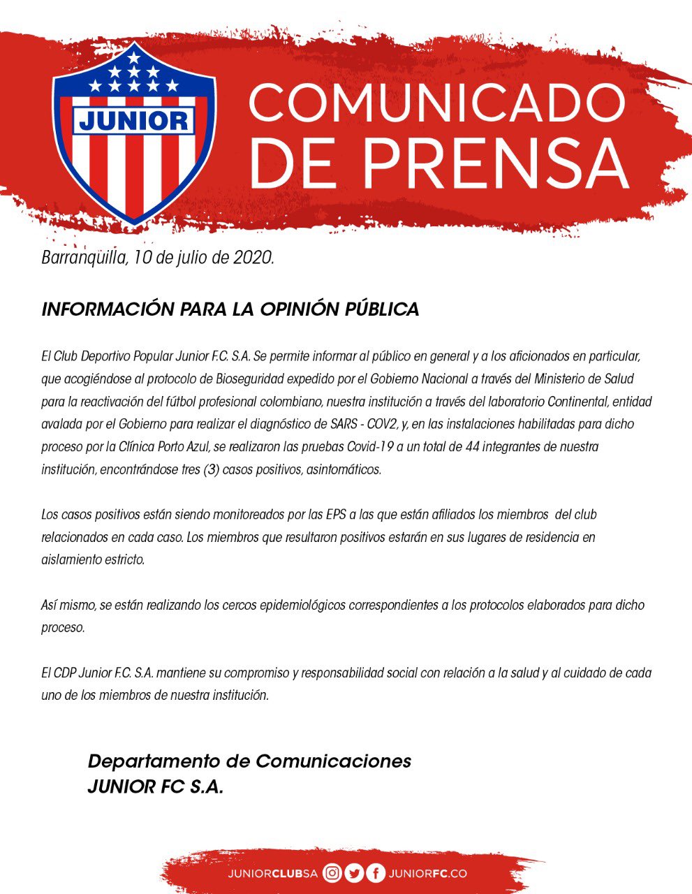 Junior de Barranquilla comunicó este viernes 10 de julio que tres integrantes de su plantel arrojaron resultados positivos para Covid-19, después de llevar a cabo durante los últimos dos días las pruebas a 44 personas que conforman su plantel de futbolistas, cuerpo técnico y colaboradores.