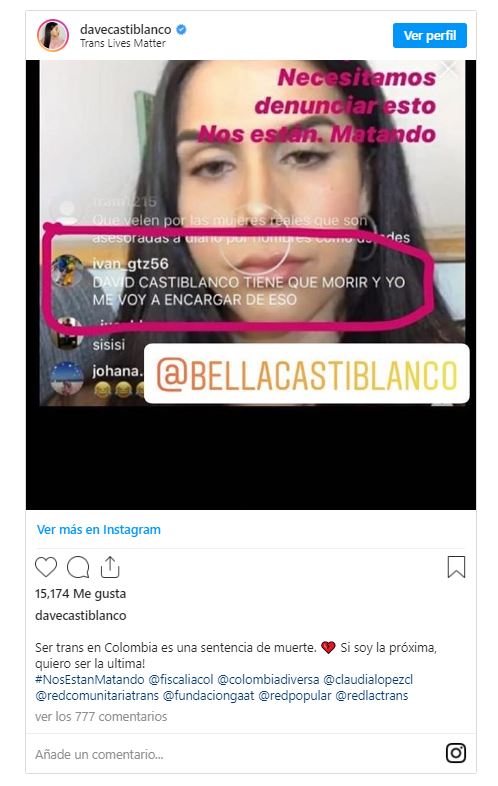 Con una gran tristeza, esta modelo trans quiso dar alerta sobre lo que podría pasar con ella, pues en el comentario, este usuario escribió: «David Castiblanco tiene que morir y yo me voy a encargar de eso».