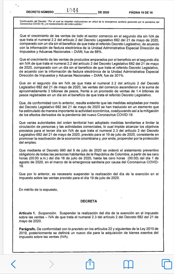A través de decreto se oficializó la suspensión del tercer día sin Iva en Colombia