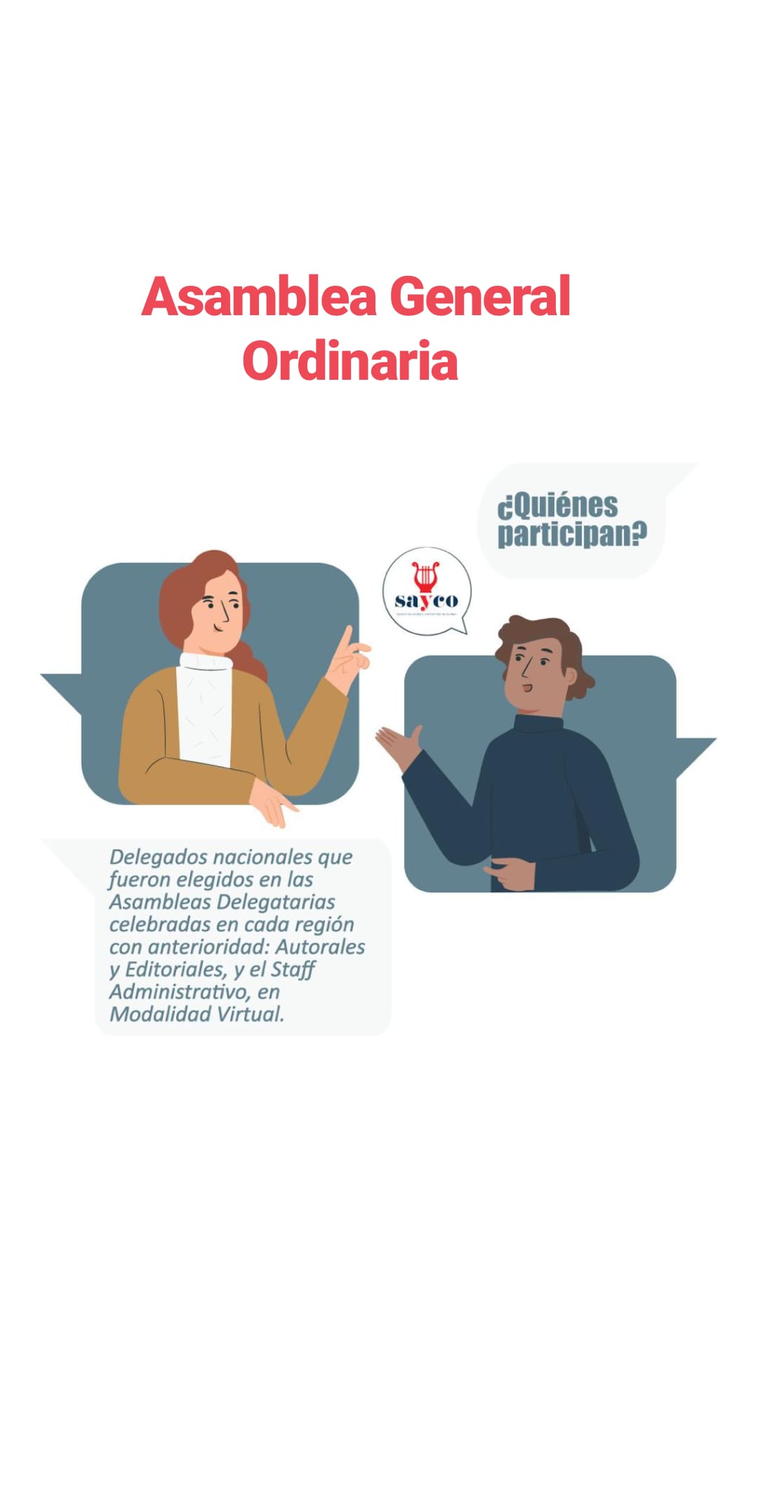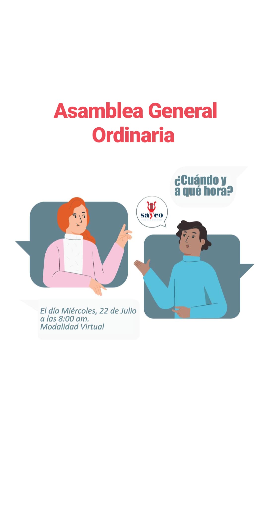 La Sociedad de Autores y Compositores de Colombia, SAYCO, tiene previsto para este miércoles 22 de Julio, a partir de las 8 de la mañana, la realización de su Asamblea General Ordinaria, el órgano más importante para que los directivos de la Sociedad presenten los balances generales, administrativos y financieros a sus socios y éstos a su vez, expresen sus inquietudes para el buen funcionamiento de la misma.