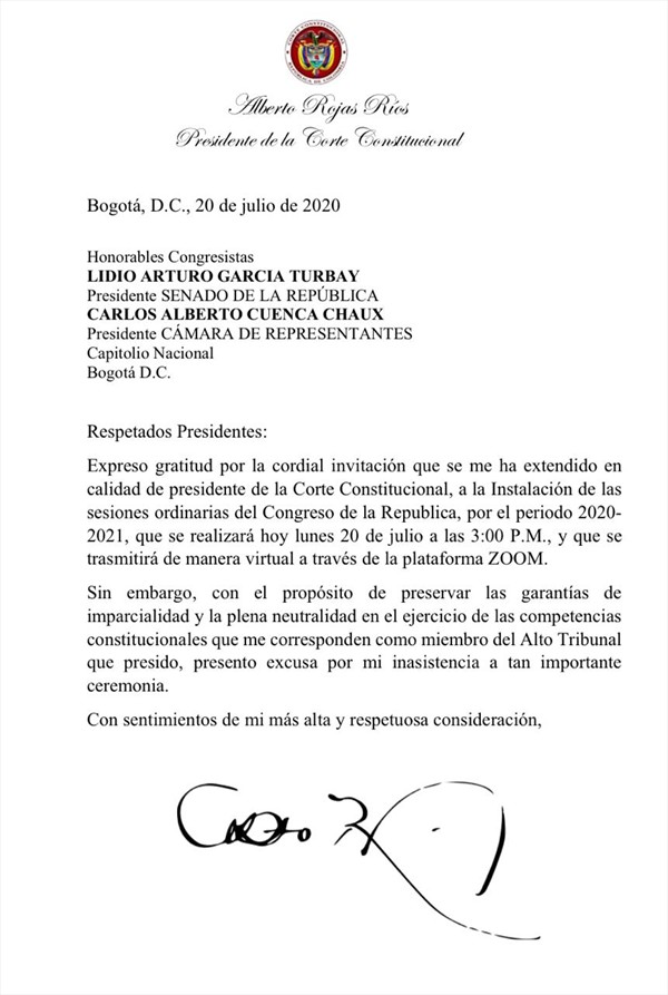 A través de una carta dirigida al actual presidente del Senado, Lidio García Turbay, el magistrado Alberto Rojas Ríos, presidente de la Corte Constitucional, indicó que no asistirá a la instalación del nuevo Congreso de la República que se realizará de manera virtual este lunes.