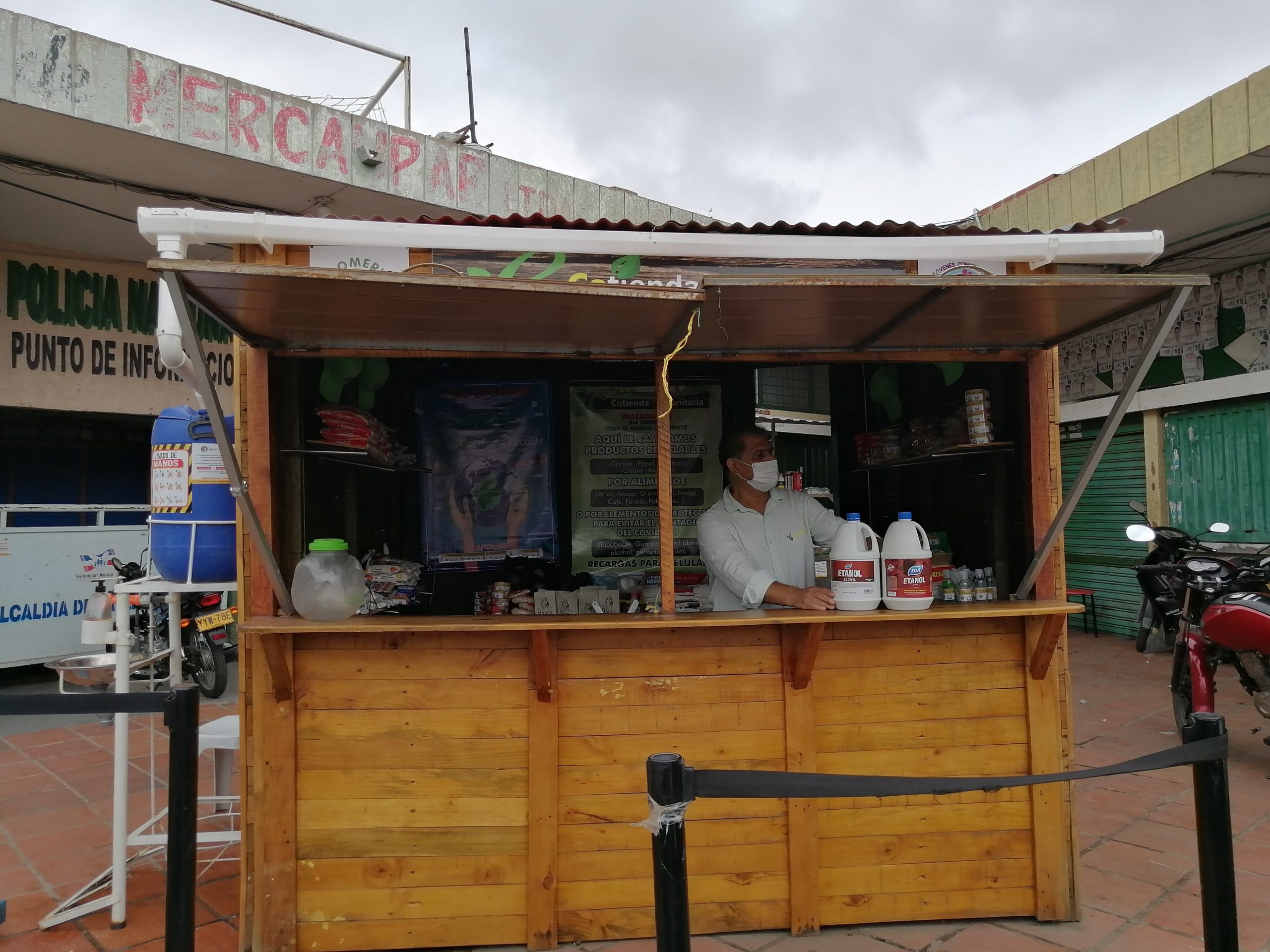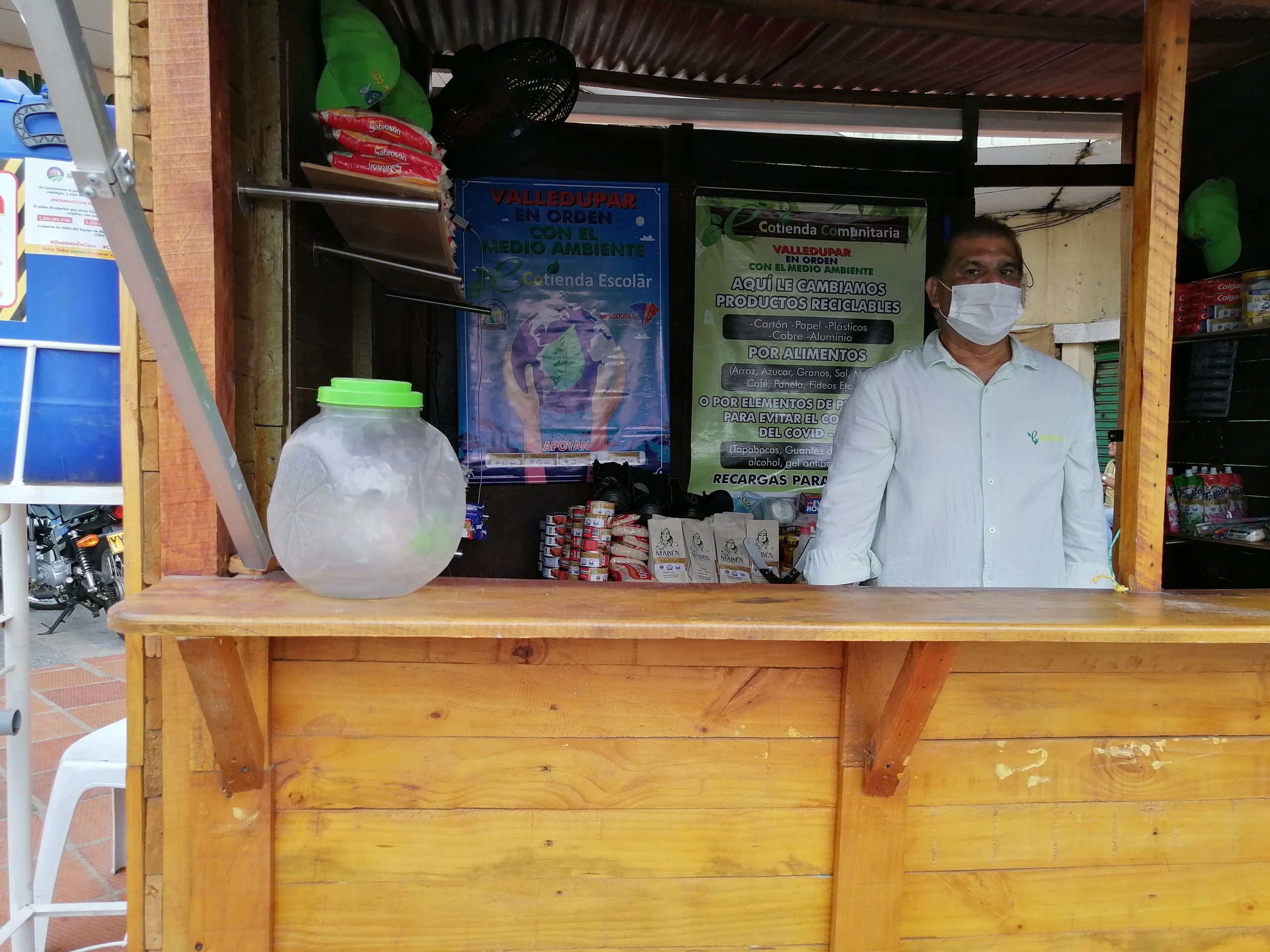 Un quiosco elaborado de madera reutilizada, instalado justo a la entrada del Mercado Popular de Valledupar, es la primera Ecotienda Comunitaria del municipio, donde se puede cambiar material reciclado por alimentos y hasta por elementos de protección contra el Covid-19. El trabajo se realiza en pro del reciclaje para contribuir con la preservación del medio ambiente.