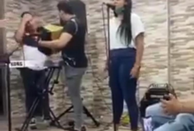 Estando en una pequeña tarima, la joven se percata de que uno de los asistentes está grabando un video y le pide que no siga registrando ese momento. Sin embargo, se hizo viral a las pocas horas de la fiesta.