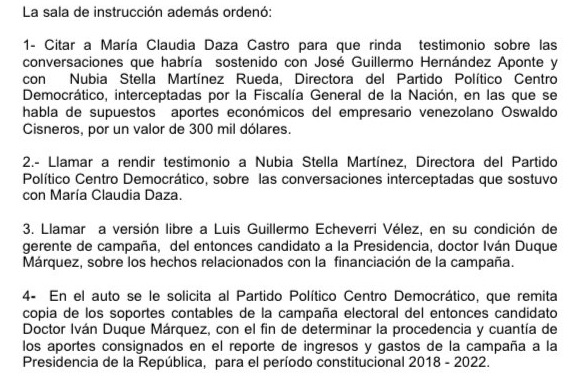 «El Consejo Nacional Electoral, CNE, a través de la Comisión Instructora Especial, integrada por los magistrados Jaime Luis Lacouture, Virgilio Almanza, y Cesar Abreo Méndez, abrió indagación preliminar contra el entonces candidato y hoy presidente de la República, Iván Duque Márquez, al gerente de la campaña Luis Guillermo Echeverri Vélez, y al Partido Político Centro Democrático, por la presunta vulneración de las normas electorales sobre financiación de campañas políticas, para el periodo constitucional 2018-2022″.