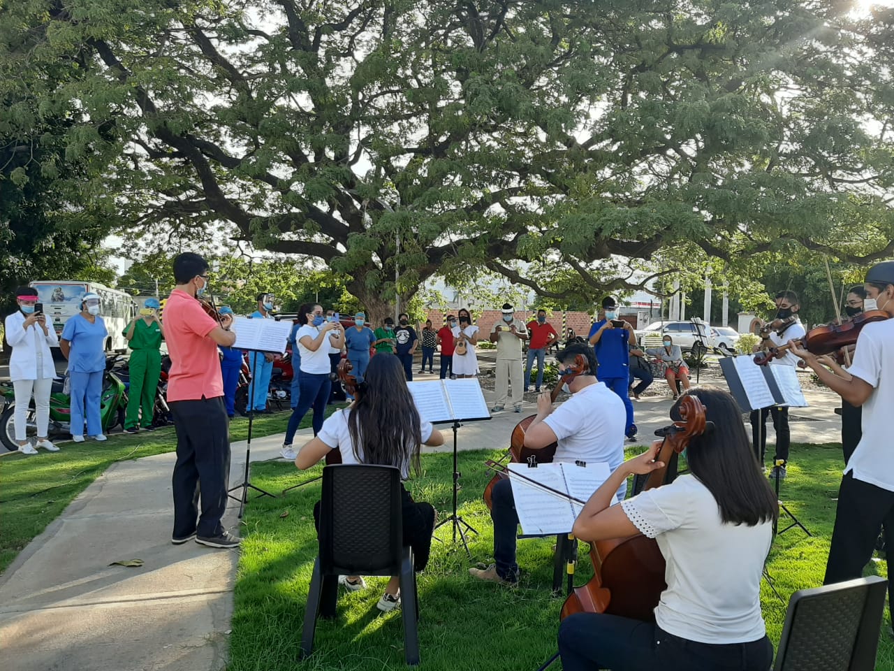 Con instrumento en manos, los jóvenes entonaron hermosos repertorios que a más de uno sacó lágrimas,a quienes llaman héroes de la salud por estar en el primer frente de batalla contra el coronavirus.