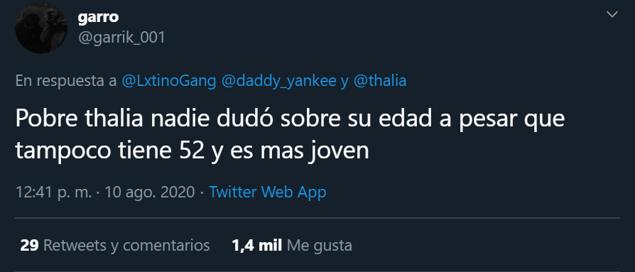 La cuenta de Twitter, Latino Gang, medio que se dedica a brindar información sobre la música latina escribió lo siguiente: “Daddy Yankee (65) y Thalia (52) son los artistas que más han recibido nominaciones a lo largo de los años en los Premios Juventud”; sin embargo, lo que en primera instancia no parecía tener mayor repercusión terminó generando todo un alboroto, debido a que los números a un lado de los nombres fueron interpretados como la edad de los cantantes, aunque en realidad hacían referencia a las veces que han sido nominados a los premios.