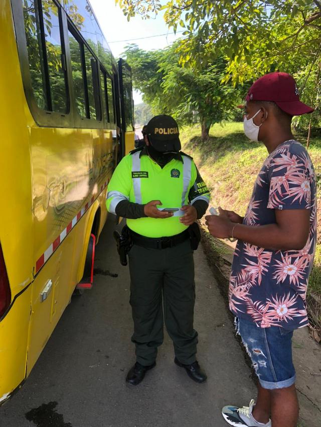 En el procedimiento, se inmoviliza el bus de placas TAZ 955, afiliado a la Cooperativa de Transportes de Arjona, aplicando un comparendo al conductor, por no estar autorizado para servicio especial, realizando el transporte informal de pasajeros, trasgrediendo las medidas sanitarias adoptadas.