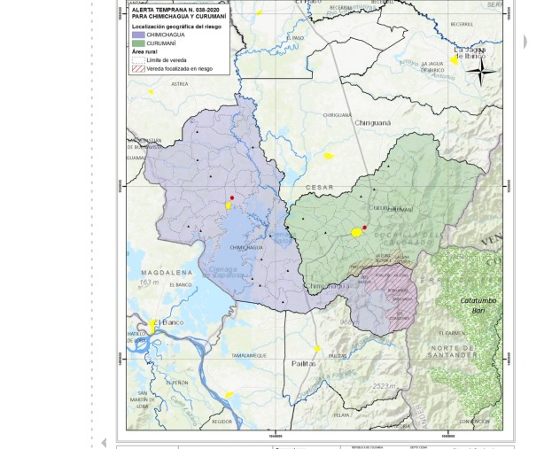 De acuerdo con la Defensorìa del Pueblo la alerta al perentorio riesgo se ha configurado sobre las veredas de Santa Lucía, Luna 1 Luna 2, El Tigre, El Horno, Dos Brazos, Nueva Unión Casa de Tabla, Bobilandia, Babilandia, Los Corazones y Pitalito del corregimiento de Pedras Blancas, en el municipio de Chimichagua.