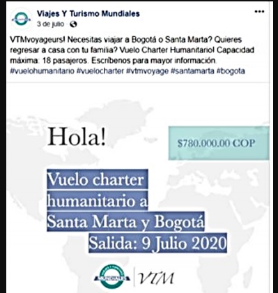 La Superintendencia señala que procedió a requerir información relacionada con este anuncio en la red social Facebook, en donde se ofertaba el vuelo chárter humanitario Santa Marta-Bogotá, por $780.000, para conocer las condiciones de ese “vuelo humanitario” del 9 de julio de 2020.