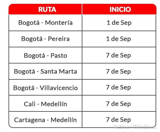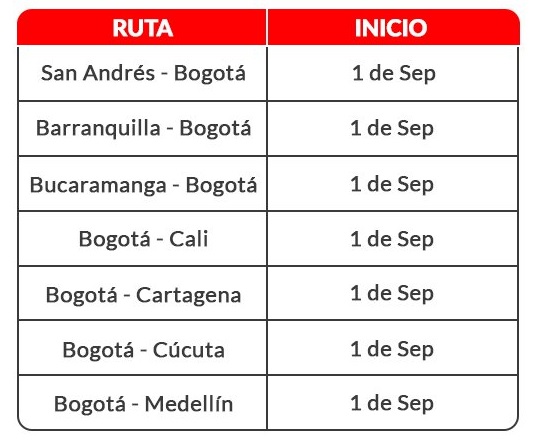 La aerolínea volverá a los cielos de Colombia conectando desde Bogotá inicialmente a destinos como Barranquilla, Bucaramanga, Cali, Cartagena, Cúcuta, Medellín, Montería, Pereira y San Andrés; y desde el 7 de septiembre reiniciará operaciones desde Bogotá a Pasto, Santa Marta, Villavicencio y desde Medellín a Cali y Cartagena.