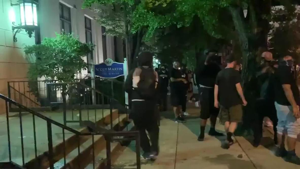 Mientras que algunos de los manifestantes protestaban de manera pacífica, otros rompieron ventanas y saltaron sobre un coche policial, según se desprende de las imágenes de las protestas, en las cuales también se puede escuchar a uno de los líderes de la congregación anunciando que han comenzado los «disturbios de BLM» en la ciudad.