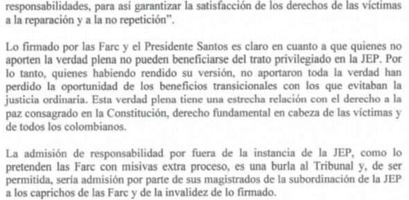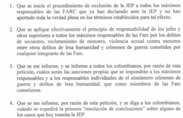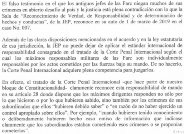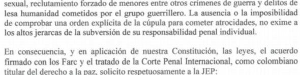 Al efecto, envió una carta la presidenta y demás magistrados de la Jep, argumentando que los sujetos de las exFarc han burlado plena y descaradamente los compromisos que asumieron en el Acuerdo de Paz.