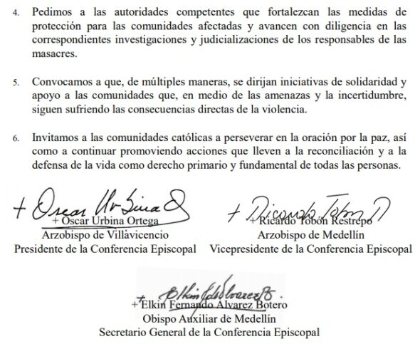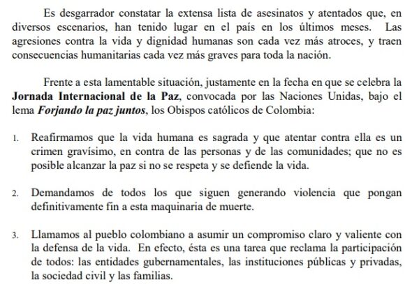 En el comunicado los obispos se muestran consternados por estos hechos y piden a quienes generan la violencia poner fin a esta maquinaria de muerte: