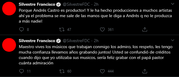 “Maestro Vives los músicos que trabajan conmigo los admiro, los respeto, les tengo mucha confianza, llevamos años grabando juntos. Usted se confundió de créditos cuando dijo que yo utilizaba sus músicos, sería feliz grabar con el papá pastor cuánta admiración”, indicó a través de una serie de tuits en su red social.