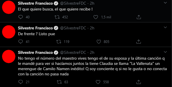 Sin embargo, le lanzó otro indirectazo. “No tengo el número del maestro Vives, tengo el de su esposa y la última canción que le mandé para ver si hacíamos juntos la tiene Claudia, se llama «La Vallenata», un merengue de Camilo Namen inédito. Que soy consciente que si no le gusta o no conecta con la canción no pasa nada”.