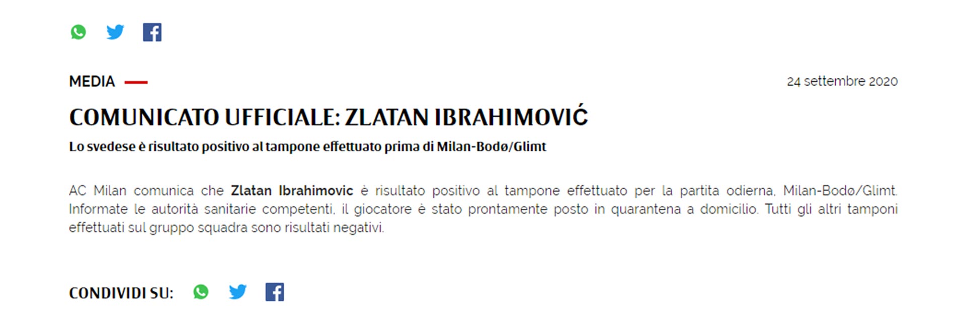 Zlatan Ibrahimović dio positivo por Covid-19 luego de una segunda ronda de pruebas de hisopado antes del juego de esta noche contra Bodø / Glimt. El Club ha informado a las autoridades pertinentes y el jugador ha sido puesto rápidamente en cuarentena en su casa. Todos los demás miembros del equipo y el personal dieron negativo.