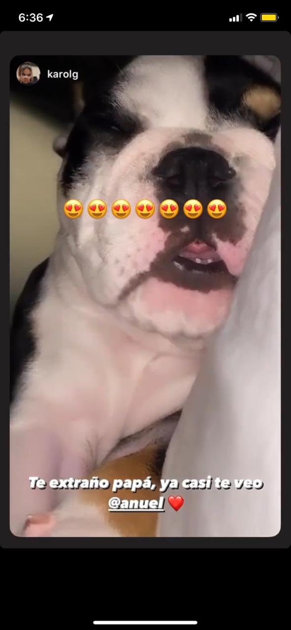 Karol G dejó a la vista un pequeño clip de su mascota, que duerme sobre una cama, y recibe cariños de ella, mientras la cámara se va acercando poco a poco. Este post está acompañado de un amoroso mensaje que hace referencia a que muy pronto el canino estará cerca de Anuel AA.