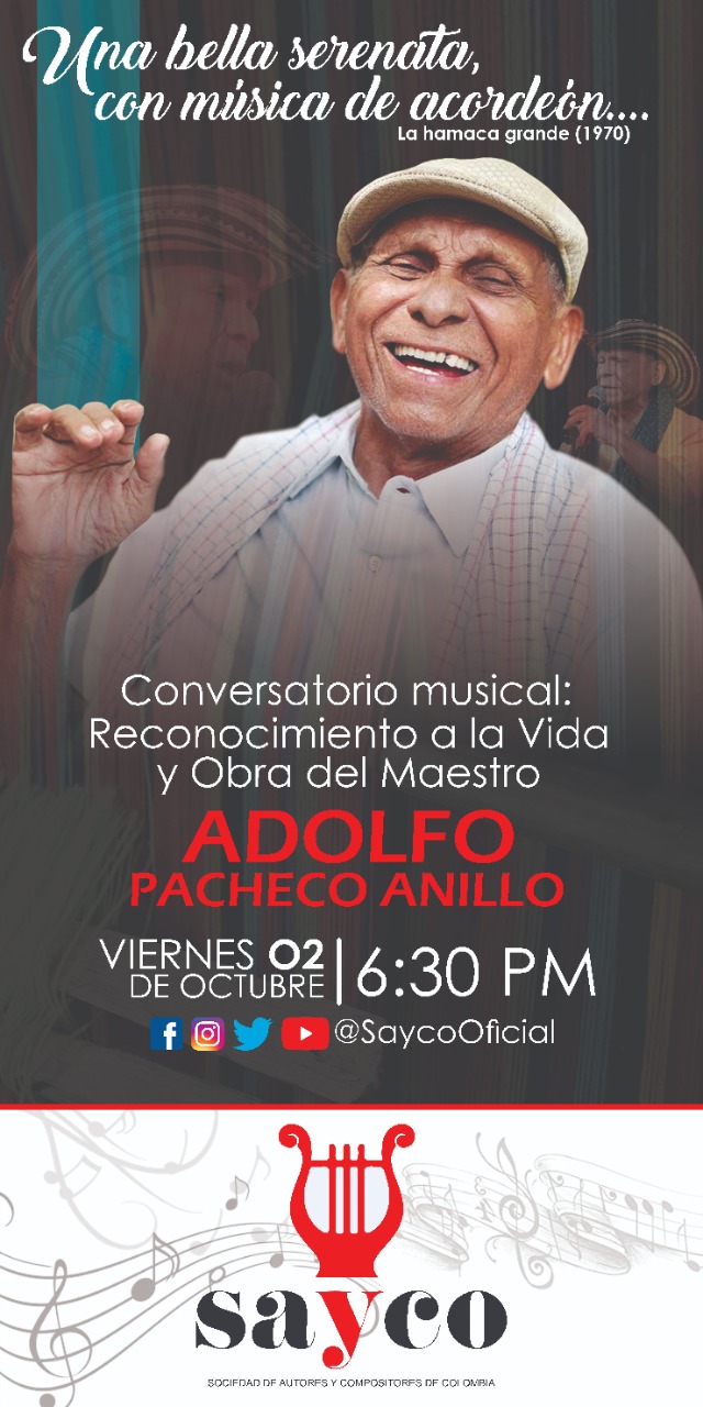 El maestro Adolfo Pacheco estará conectado desde su hogar en Barranquilla donde recibirá la distinción de la Cruz de Santa Cecilia, el mayor reconocimiento que SAYCO realiza a los juglares del folclor, además se le entregará una retribución económica.