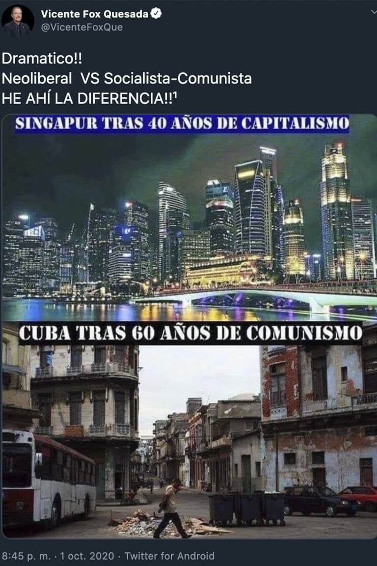 “¿En donde estamos y a donde vamos? ¡Nos están llevando al baile! ¡Despertemos Mexicanos!”, fue lo que escribió el ex mandatario al respecto además de compartir expresiones de rechazo y hasta un meme de “neoliberales vs socialistas-comunistas” con dos imágenes una lujosa zona de hoteles y otra de Cuba en pobreza.